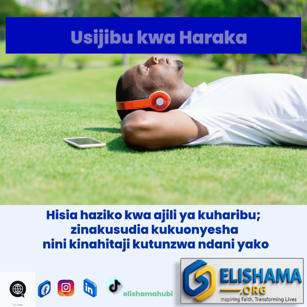 Mwisho wa siku, kujibu mara moja si suluhisho. Kujitenga kidogo, kuelewa hisia zako, na kuchukua hatua ya busara kunalinda heshima yako, afya ya akili, na mahusiano yako na wengine. Mwili na nafsi yako zinathamini kila hatua unayoichukua ya kudhibiti hisia zako. Kila mara unapojifunza kudhibiti hisia, unajenga nguvu za kisaikolojia zinazokuwezesha kuwa mtu mwenye busara, amani, na heshima.